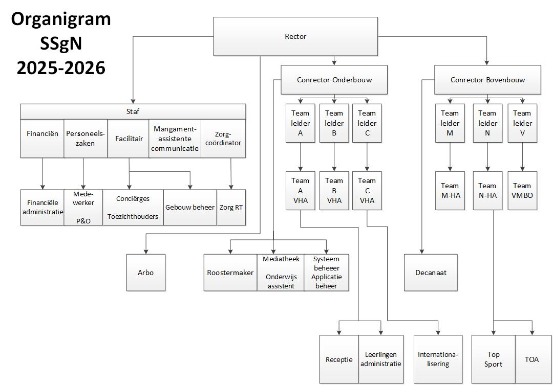 De SSgN is georganiseerd volgens het principe van resultaatverantwoordelijk management. Er is een duidelijke afdelings- en teamstructuur. Door te werken in kleinere eenheden bevorderen we een gevoel van eigenaarschap. Ook het gebouw is globaal ingedeeld in kleinere afdelingen waarbinnen een team of sectie de verantwoordelijkheid draagt: er is een aparte vleugel voor cultuur en voor de bètavakken en leerlingen krijgen zoveel mogelijk lessen in een klein aantal lokalen.